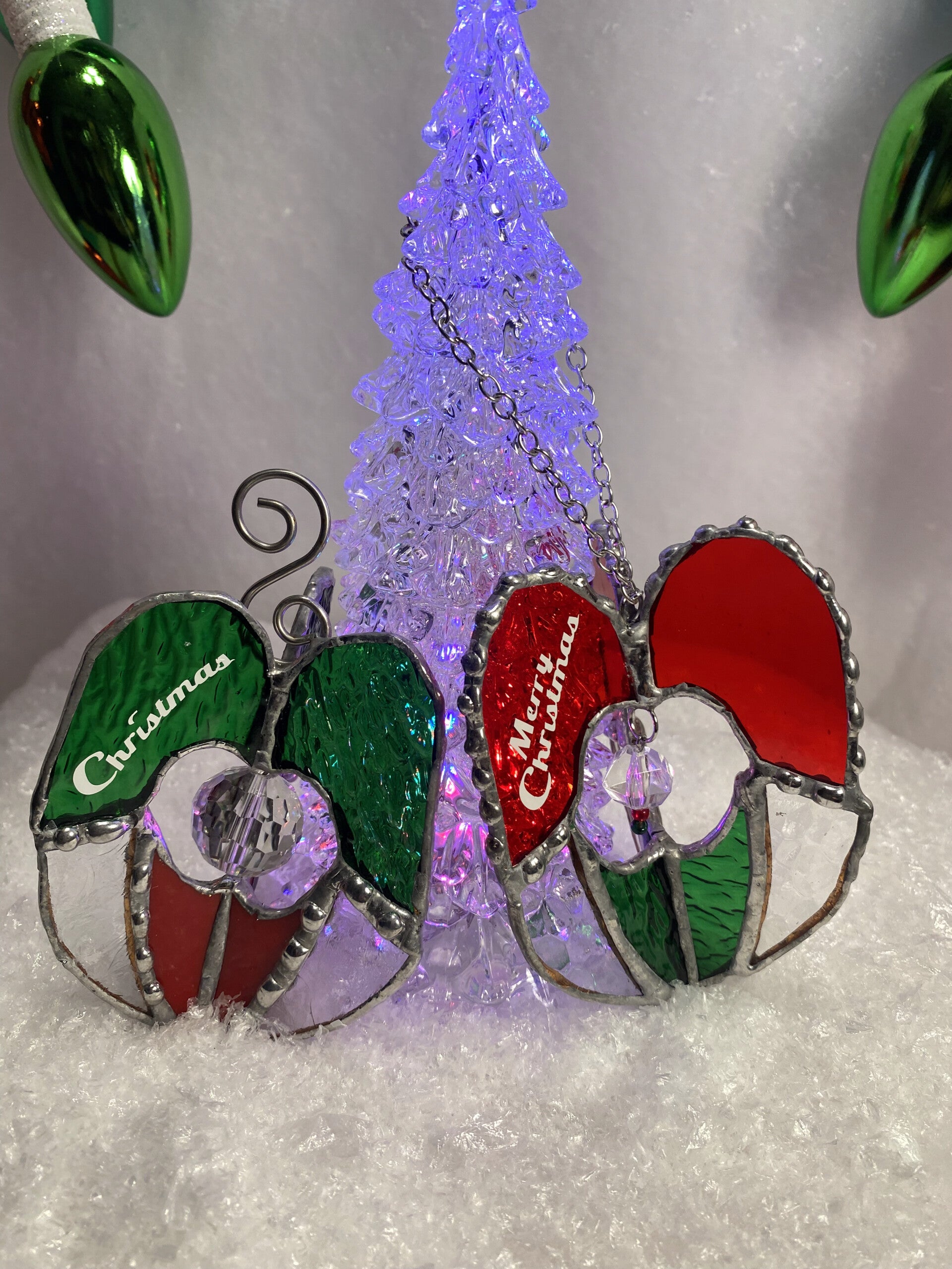 A handcrafted Christmas globe ornament made from real red & green stained glass, designed to shine year after year.