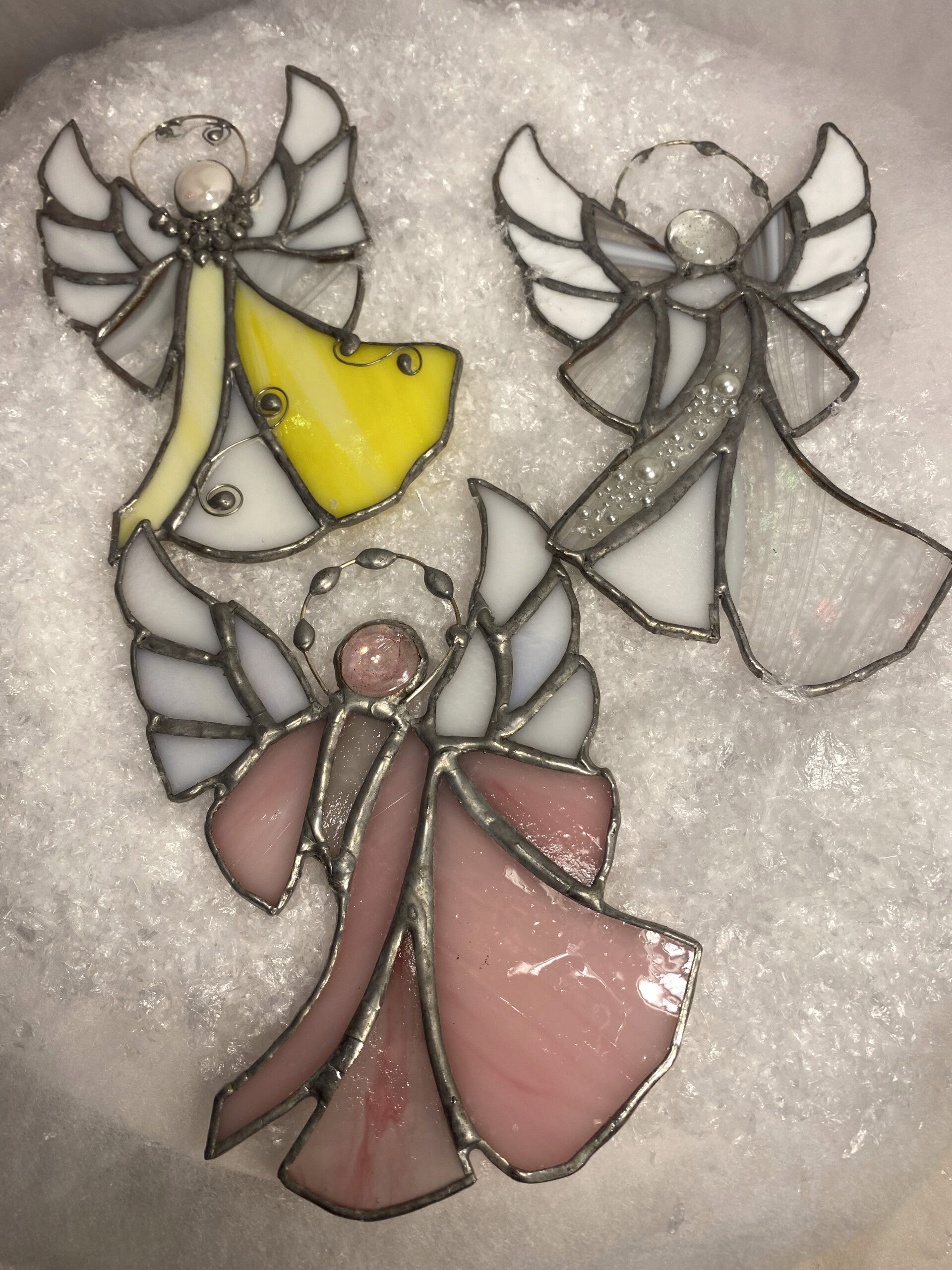 This stained-glass angel is hand-cut, foiled, and soldered with care. Her graceful wings and glowing glass colors offer a symbol of comfort, hope, and protection.