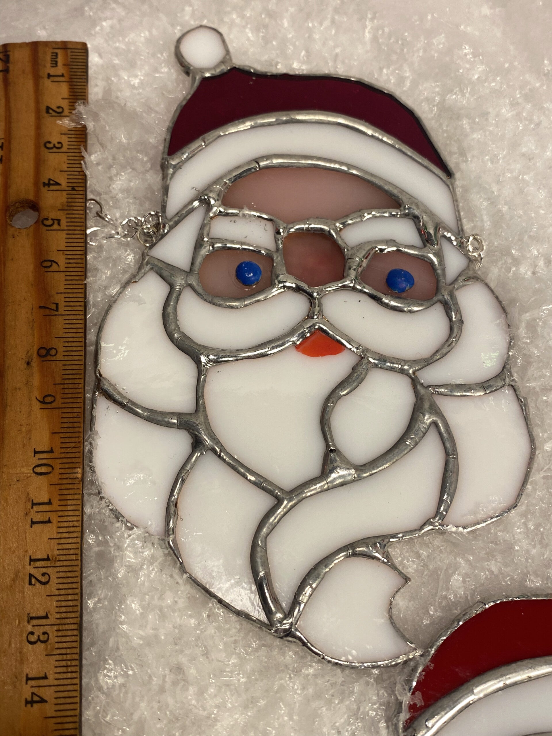 Each Santa is individually hand-cut from stained glass, wrapped in copper foil, and soldered by hand. No two Santas are alike--each one has its own personality.