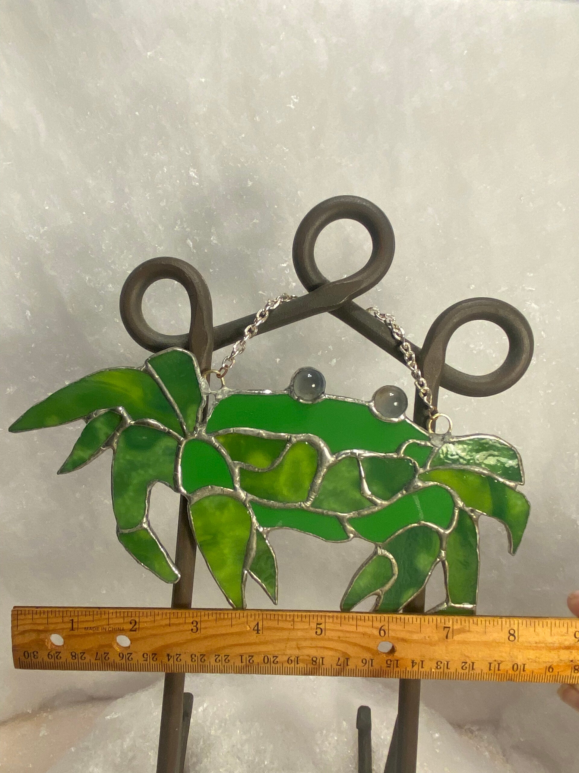 This stained-glass crab crafted in rich shades of green, capturing the personality of ocean life and adding a splash of seaside fun to any window or beach-themed decor.