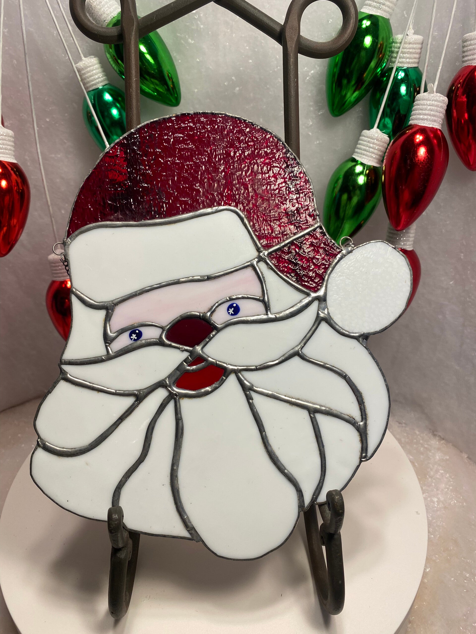 This Santa is individually hand-cut, foiled, and soldered, making every piece one-of-a-kind. The vibrant glass catches the light, bringing a warm holiday glow to any space.