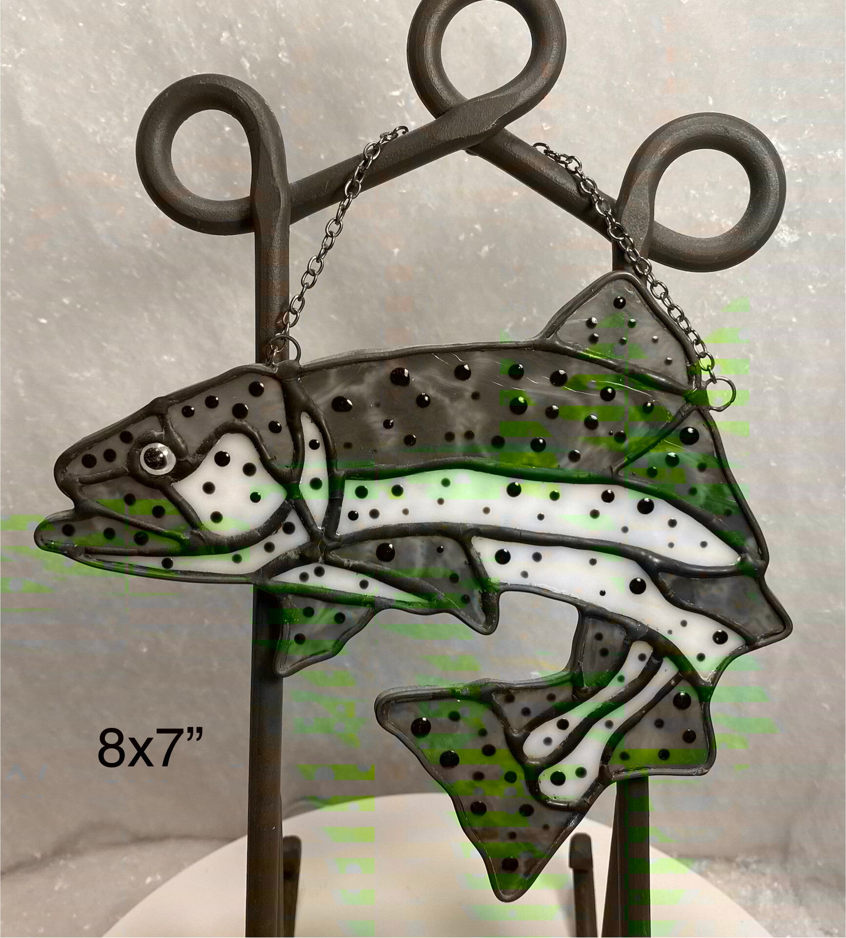 This handcrafted stained-glass trout brings a splash of color and its vibrant glass captures sunlight, creating a shimmering lively accent.